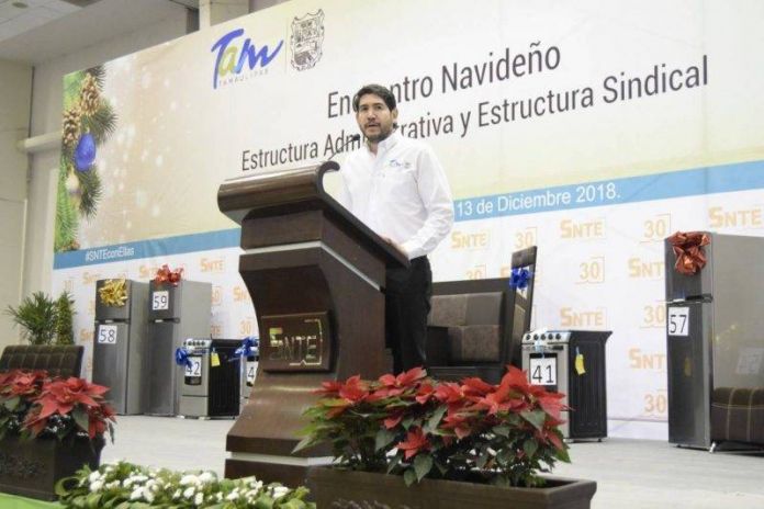 Acompañado del Secretario General de la Sección 30 del SNTE, José Rigoberto Guevara Vázquez, Escobar Salazar destacó: “Por mi conducto, el Gobernador de Tamaulipas me ha conferido hacerles llegar un afectuoso saludo en esta Convivencia Navideña, la cual contribuye a fortalecer la integración, la armonía y la unidad, a través de la cercanía con los agremiados de la Sección 30 del Sindicato”.