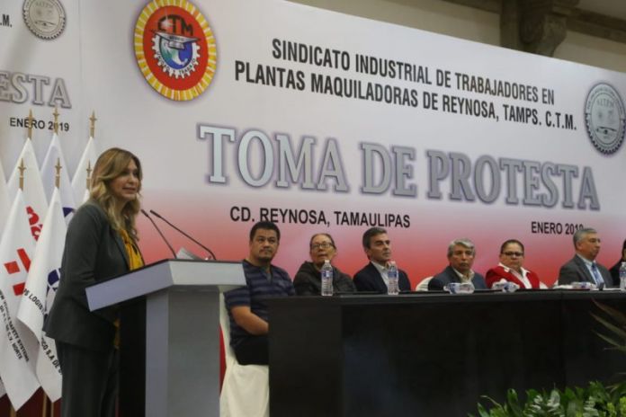 La mañana de este viernes 11, la Alcaldesa fue invitada de honor en la Toma de Protesta del Comité Ejecutivo General del Sindicato Industrial de Trabajadores en Plantas Maquiladoras de Reynosa con el dirigente de la Federación de Trabajadores de Tamaulipas, Edmundo García Román, y de la CTM local, Reynaldo Garza Elizondo.