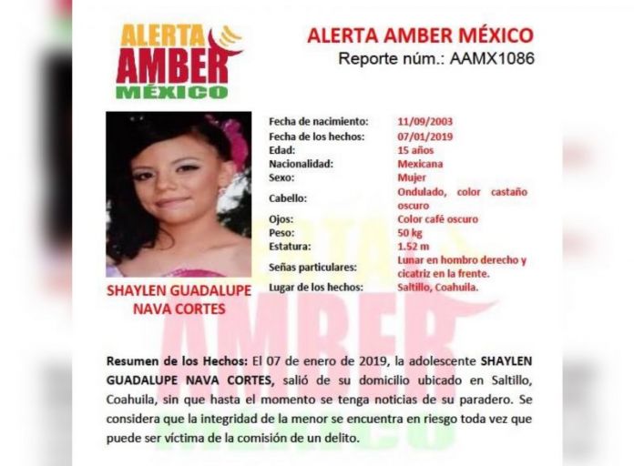Shaylen desaparecio en Saltillo, Coahuila el pasado siete de enero del presente año.