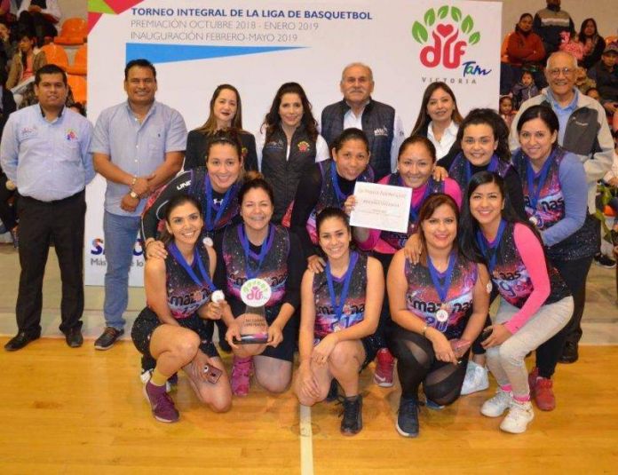 Ciudad Victoria, Tam., 13 de febrero de 2019. La Señora Arcelia Flores de González, presidenta del Sistema para el Desarrollo Integral de la Familia (DIF Victoria), participó en la ceremonia de clausura y premiación del Torneo de la Liga Integral de Basquetbol, octubre 2018 – enero 2019, llevada a cabo en el Gimnasio “Manuel Raga Navarro”.