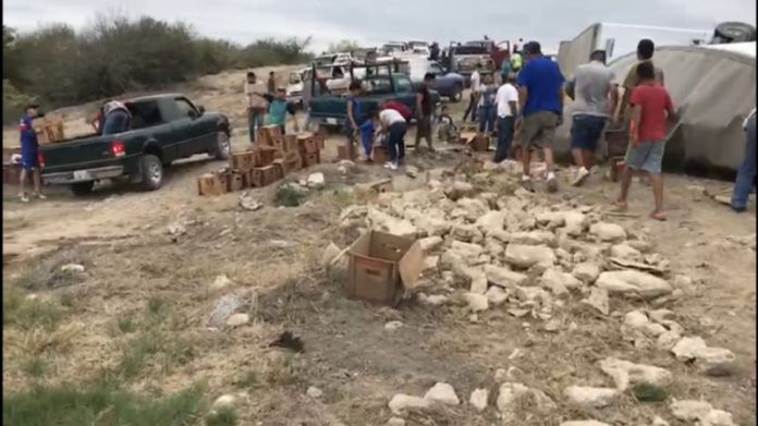 Cómo encontrar un oasis en el desierto, así fue como conductores que circulaban por la carretera Victoria-Zaragoza se toparon con la volcadura de un tráiler el cual transportaba cerveza, por lo que no se hizo esperar la rapiña.