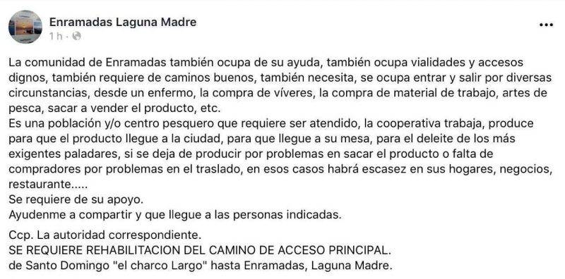 El comunicado dice: “La comunidad de Enramadas también ocupa de su ayuda, también ocupa de vialidades y accesos dignos pues necesita entrar y salir por diversas circunstancias, desde un enfermo hasta la compra de víveres, la compra de material de trabajo, artes de pesca y sacar y vender el producto del mar”.