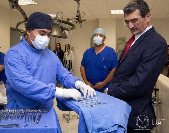 Más adelante, y acompañado por la directora de la FEV, Laura Roxana de los Reyes Nieto, hizo un recorrido por el Laboratorio de Prácticas Clínicas, donde constató las diversas áreas y el equipamiento con que cuenta el alumnado para lograr competencias que les permitan brindar una atención de calidad en el cuidado de la salud.