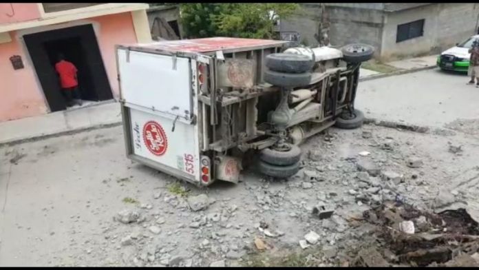 El camión siguió avanzando hasta tumbar una barda de un domicilio particular y final mente quedar volcado sobre uno de sus costados.