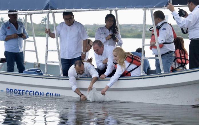 Contando con el apoyo de autoridades de Pesca y de planteles de educación superior para impulsar acciones dirigidas a la preservación y reproducción de especies acuáticas, la presidenta municipal Alma Laura Amparán Cruz, acompañada del secretario estatal de Pesca y Acuacultura, Raúl Ruiz Villegas, y de los rectores de la UPALT, UTMAR y UTA, Gustavo Hernández Martínez, Antonio Garza de Yta, e Isaac Rebaj Sevcovicius, sembró 50 mil crías de tilapia en el sistema lagunario Champayán.