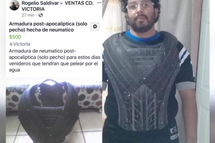 “Se vende armadura post-apocaliptica (solo pecho) hecha de neumático; Armadura de neumatico post-apocaliptica (solo pecho) para estos dias venideros que tendran que pelear por el agua”.