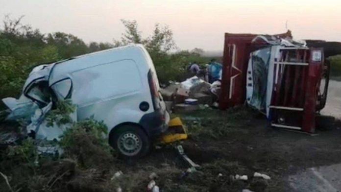 Al final el camión y la camioneta terminaron por chocar de frente muriendo el empleado al instante.