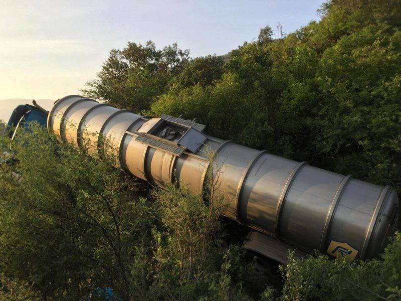 Según comentó el chofer al ir circulando por la carretera Rumbo Nuevo, otro tráiler que circulaba en la misma dirección lo rebasó y le dio un cerrón lo que provocó que perdiera el control y terminará volcando a un costado de la carretera donde el auto-tanque estuvo a punto de caer por un barranco, afortunadamente este quedó sobre la maleza.