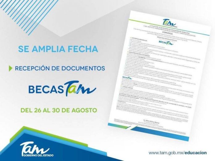 Con la finalidad de dar continuidad al recibimiento de solicitudes para el programa becario BECAS TAM de escuelas públicas correspondiente al ciclo escolar 2019-2020, se extiende el plazo para el trámite y entrega de documentación del 26 al 30 de agosto del presente año.