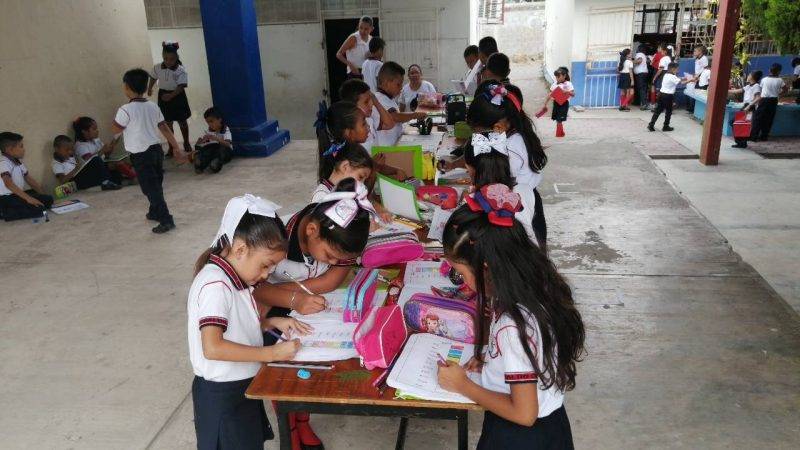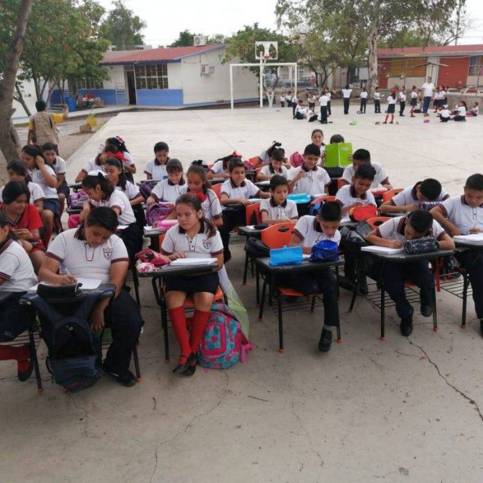 Los alumnos desde primero a sexto grado se encuentran recibiendo sus respectivas clases en el patio de dicho plantel, el cual se ubica en la Colonia Liberal.