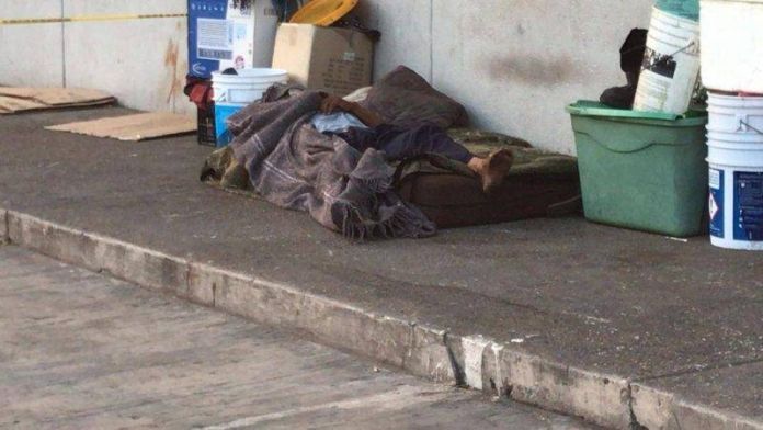 Juan se encontraba acostado sobre un colchón que estaba en plena vía pública, y a su lado estaban cajas de plástico, botes de plástico, cobijas, y diversa ropa.