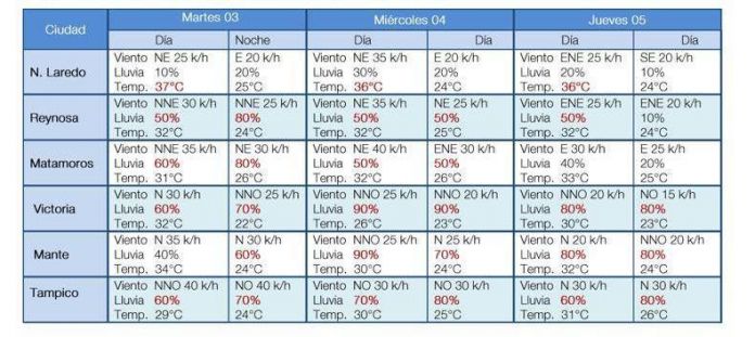 Se prevé a partir del martes temperatura máxima de 32°C y mínimas de 22°C, con viento moderado de dirección norte de 20-30 km/h con rachas que podrían superar los 50 km/h principalmente en zonas costeras. Alta probabilidad de lluvia de moderada a muy fuerte durante el periodo de pronóstico. Se mantendrá clima fresco en zonas altas (mínima de 13°C en Miquihuana).