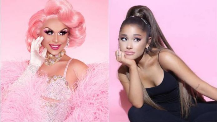 La drag queen utilizó sus redes sociales para mostrar una foto comparativa de ella y Ariana, en la que ambas lucen un vestido parecido, cabello rosa, collar y aretes similares.