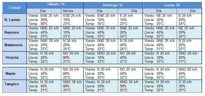 Se prevé a partir del sábado temperatura máxima de 33°C y mínimas de 21°C, con viento moderado de dirección norte – noroeste de 20-25 km/h con rachas que podrían superar los 50 km/h principalmente en zonas costeras. Alta probabilidad de lluvia de ligera a moderada durante el sábado. Se mantendrá clima fresco en zonas altas (mínima de 11°C en Miquihuana).