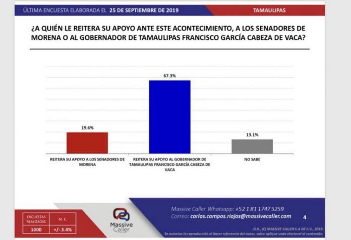 Una encuesta publicada este jueves por Massive Caller, revela que el mandatario tamaulipeco, Francisco García Cabeza de Vaca tiene una apoyo absoluto ante el intento de senadores del partido Morena de querer desaparecer poderes en la entidad y buscar ellos, imponer un gobernador interino.