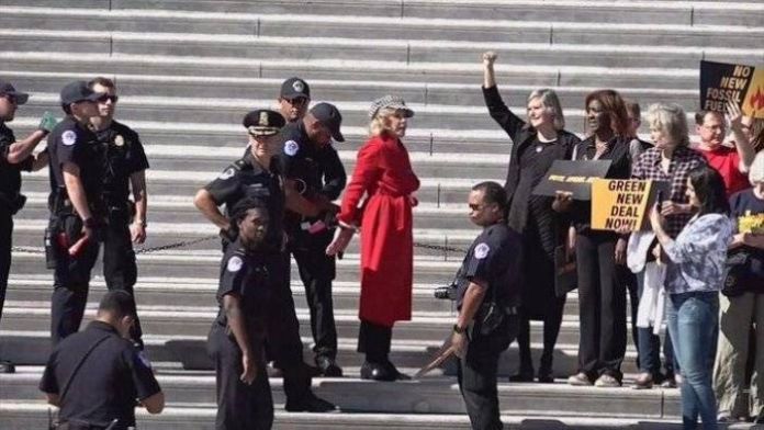 Fonda fue una de las 16 personas arrestadas por “manifestarse ilegalmente en el frente este del Capitolio de Estados Unidos”, acusados de “hacinamiento, obstrucción e incomodidad”, de acuerdo con la policía.