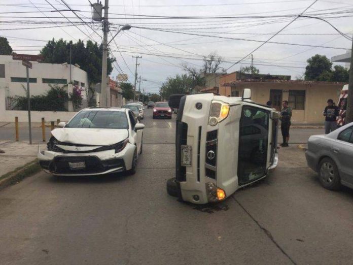 Al omitir el señalamiento de alto un automóvil de lujo marca Honda impacto la camioneta de manera lateral para después provocar que esta terminara volcada por uno de sus costados.