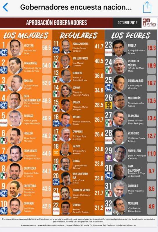 La encuesta del mes de octubre de Arias Consultores, refleja que García Cabeza de Vaca, es el segundo Gobernador estatal con la más alta aprobación por su desempeño, al obtener 54 por ciento, nivel de aprobación por los tamaulipecos.