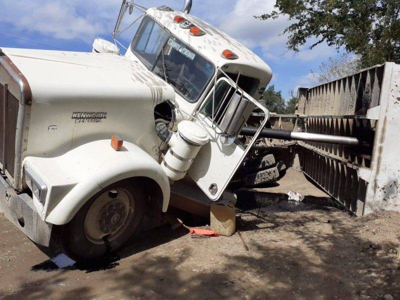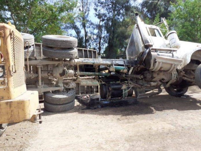 Al empezar a subir la caja para tirar la carga, el pistón que sale del tractor camión sufrió una falla y provoco que la pesada unidad declinara hacia su izquierda hasta quedar acostado.