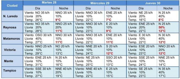 Se prevé a partir del martes temperatura máxima de 29°C y mínimas de 12°C, con viento moderado de dirección norte de 20-25 km/h con rachas que podrían superar los 50 km/h principalmente en zonas costeras. Se mantendrá clima frío en zonas altas (mínima de 3°C durante la noche en Miquihuana).
