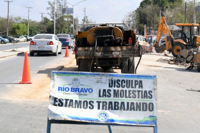 Personal de Servicios Públicos Primarios de Río Bravo, trabaja en la rehabilitación a través del programa de bacheo de la avenida Francisco I Madero, a la altura de la colonia Del Valle.