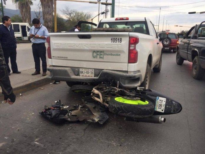 Cd. Victoria, Tam.- Estampado en la parte posterior de una camioneta de la Comisión Federal de Electricidad, terminó un motociclista el cual debido a las lesiones tuvo que ser trasladado a un hospital.