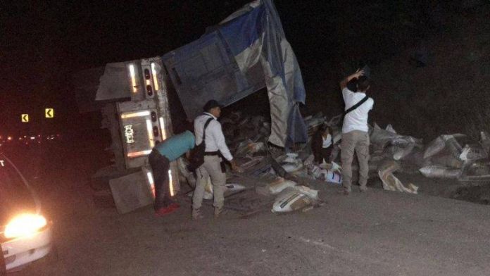 Cd. Victoria, Tam.- Sin importarles que dos personas resultaran lesionadas durante la volcadura de un tráiler, personas a bordo de camionetas hicieron acto de rapiña y se apoderaron de costales llenos de fertilizantes.