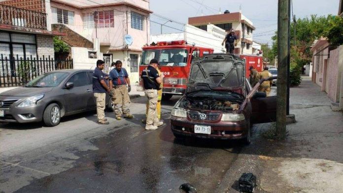 Presuntamente un cortocircuito en el acumulador, provocó que un vehículo estuviera a punto de incendiarse en la zona centro de Ciudad Victoria.