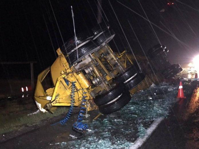 El accidente ocurrió cuando el segundo remolque de un tráiler que transportaba varias toneladas de vidrio se zafó y terminó volcando sobre la carretera.
