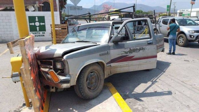 Tras el impacto el conductor de la camioneta Dakota perdió el control y se estrelló contra el tubo metálico que se ubica a la entrada de dicho centro comercial.