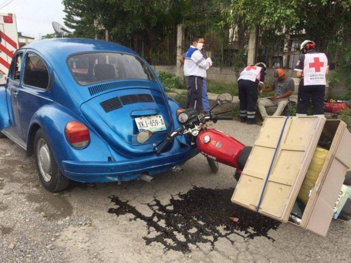 Daños materiales mínimos y una persona lesionada dejó como saldo una colisión entre un Volkswagen tipo vocho y una motocicleta, al final cada quien pagará sus daños.