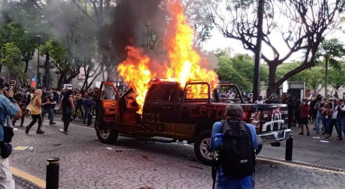 Después de graffitear los vehículos, un grupo de manifestantes les prendieron fuego y sacaron un arma larga que abandonaron en el piso. Durante algunos minutos se escucharon explosiones provenientes de las patrullas y los manifestantes se dispersaron en Plaza Liberación, detrás de la Catedral de Guadalajara.