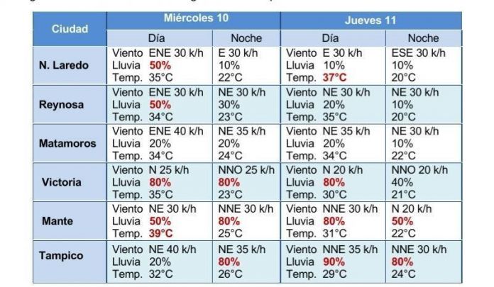 Se prevé a partir del miércoles temperatura máxima de 35°C y mínimas de 21°C, con viento moderado de dirección norte de 20-25 km/h con rachas que podrían superar los 50 km/h principalmente en zonas costeras. Alta probabilidad de lluvia de moderada a fuerte puntual durante el periodo de pronóstico. Se mantendrá clima fresco en zonas altas (mínima de 11°C durante la noche en Miquihuana).