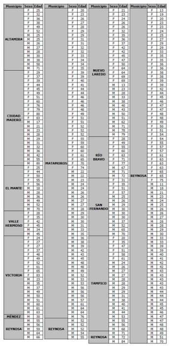 Dos mujeres de 41 y 64 años, así como dos hombres de 55 y 60 años de Reynosa; una mujer de 62 años de Nuevo Laredo; una mujer de 85 años de Tampico; un hombre de 64 años de Matamoros, todos ellos el 29 de junio; un hombre de 56 años de Madero; una mujer de 57 años de Reynosa; un hombre de 67 años de Nuevo Laredo, el 30 de junio; un hombre de 54 años de Reynosa; una mujer de 85 años de Victoria; un hombre de 49 años y una mujer de 57 años de Matamoros, el 1 de julio; y una mujer de 91 años de Tampico el 2 de julio.