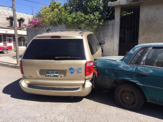 Una camioneta tipo Caravan que participó en un accidente, acabó estrellándose contra la barda de un domicilio y un vehículo estacionado.