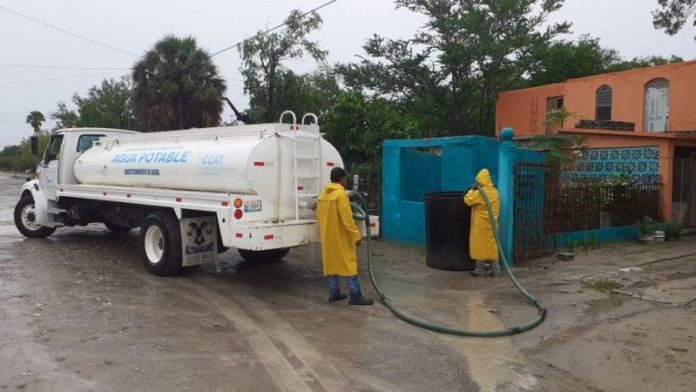 Uniendo esfuerzos con la Comisión Estatal del Agua de Tamaulipas -Ceat- y la Comisión Municipal de Agua Potable y Alcantarillado -Comapa-, se lleva a cabo el suministro de agua a través de pipas cisternas a las mas de quinientas familias de la colonias mas vieja y grande de la cabecera municipal.