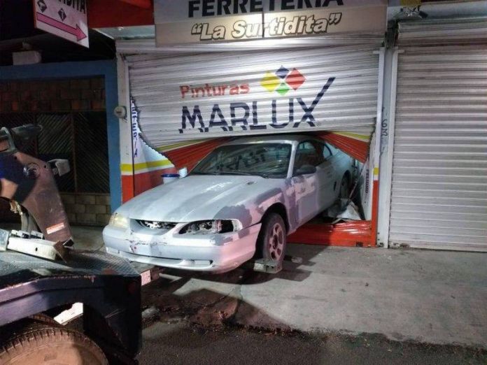 Sin embargo por accidente el conductor pisó el acelerador en lugar del freno y terminó estrellándose contra la cortina de un negocio para quedar con la mitad del auto adentro.
