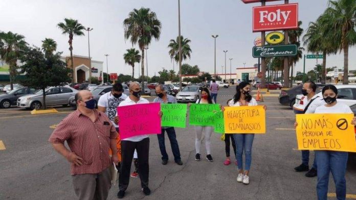 Despues de cinco meses de ver suspendidas sus actividades por la pandemia del covid-19, con cartulinas en mano, propietarios y trabajadores de gimnasios y centros Fitness solicitaron a las autoridades se les permita trabajar guardando las disposiciones de uso de cubrebocas y sana distancia entre otras medidas.