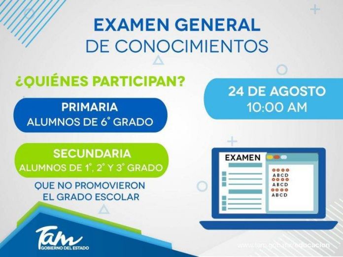 Al dar continuidad al compromiso del Gobernador del Estado, Francisco García Cabeza de Vaca por impulsar acciones que permitan elevar la calidad de la educación de niños y jóvenes tamaulipecos, la Secretaría de Educación de Tamaulipas llevará a cabo la evaluación en línea del Examen General de Conocimientos para los alumnos de 6º grado de educación primaria, así como a los alumnos que cursaron 1º, 2º y 3º de educación secundaria que no fueron promovidos en el ciclo escolar 2019-2020.