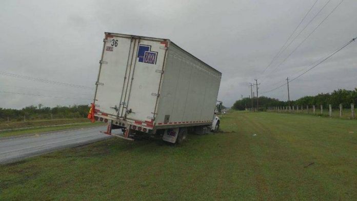 Fuera de la carretera terminó un camión International, presuntamente después de que su conductor perdiera el control por lo resbaladizo de la carretera.