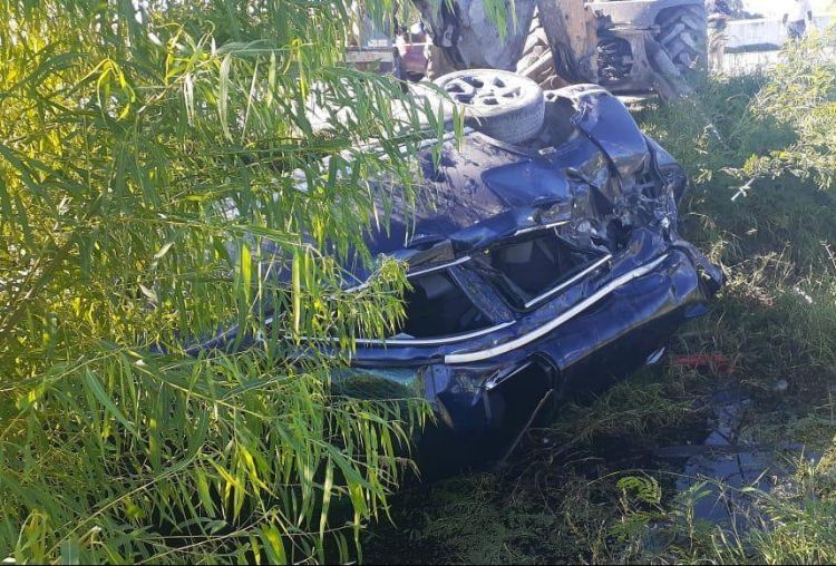 Matamoros, Tam..- Una camioneta que presuntamente chocó contra un trascabo y la plataforma de un tráiler para después volcar y terminar en el interior de un canal, dejó un trágico saldo de dos mujeres sin vida.