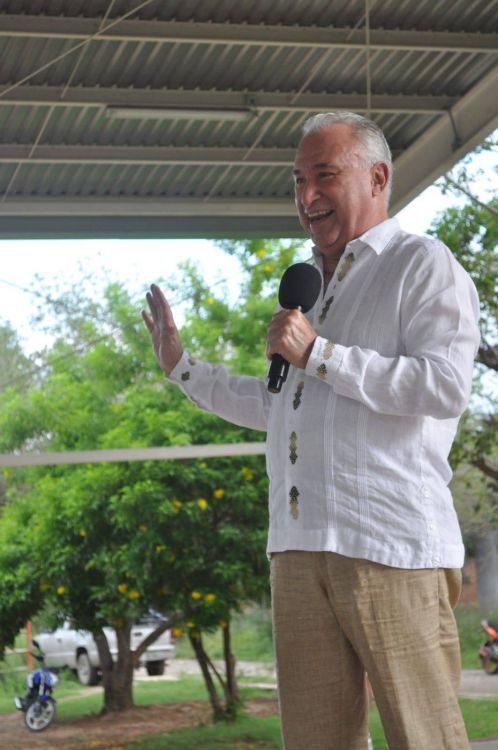 El de la voz es Héctor Martín Garza González; ha atendido una invitación de las autoridades ejidales, de gente del campo victorense, tiene el micrófono en su mano en lo alto de una plataforma de concreto, bajo una techumbre en el ejido Congregación Caballeros.
