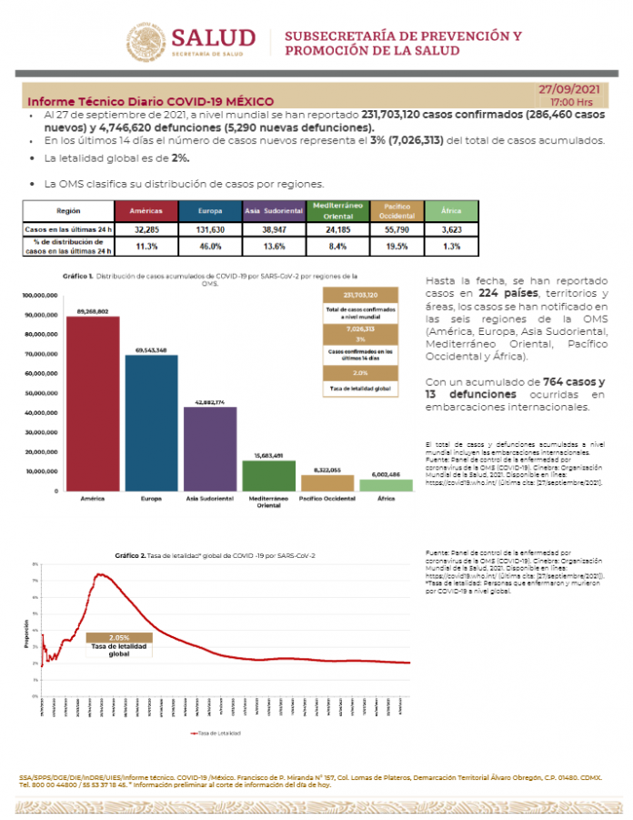 México.- En este día, la Secretaría de Salud informó que México suma 3 millones 635 mil 807 casos y 275 mil 676 muertes por COVID-19.