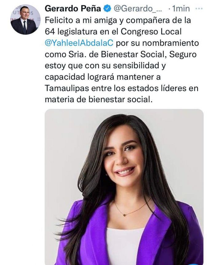 «Felicito a mi amiga y compañera de la 64 legislatura en el Congreso Local @Yahleel Abdala C. por su nombramiento como Sria. de Bienestar Social, Seguro estoy que con su sensibilidad y capacidad logrará mantener a Tamaulipas entre los estados líderes en materia de bienestar social».