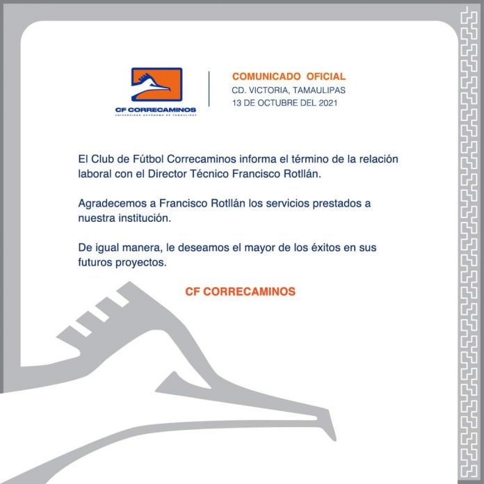 Cd. Victoria, Tam.- Luego de una victoria, cinco derrotas, dos empates y escasos 13 puntos, Francisco Rotllán dejó al equipo de casa, el Correcaminos.