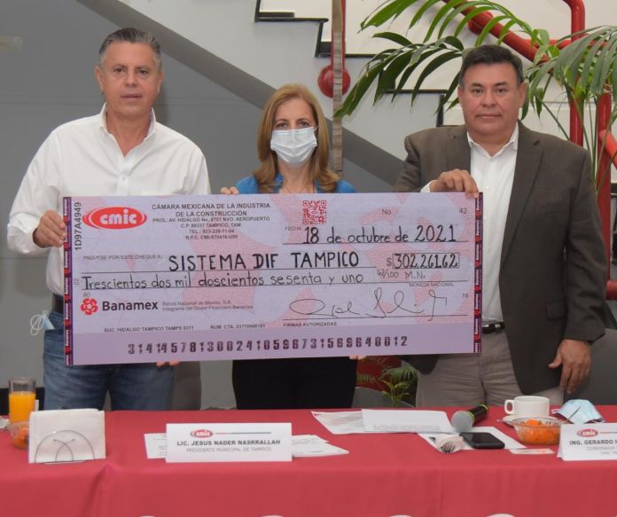 «Nos es grato informar que la Cámara Mexicana de la Industria de la Construcción, Delegación Tamaulipas en la zona sur, entrega un cheque con valor de 302 mil 261 pesos con 62 centavos para el Sistema DIF Tampico, a fin de que continúe realizando obras sociales en beneficio de los tampiqueños», dijo.