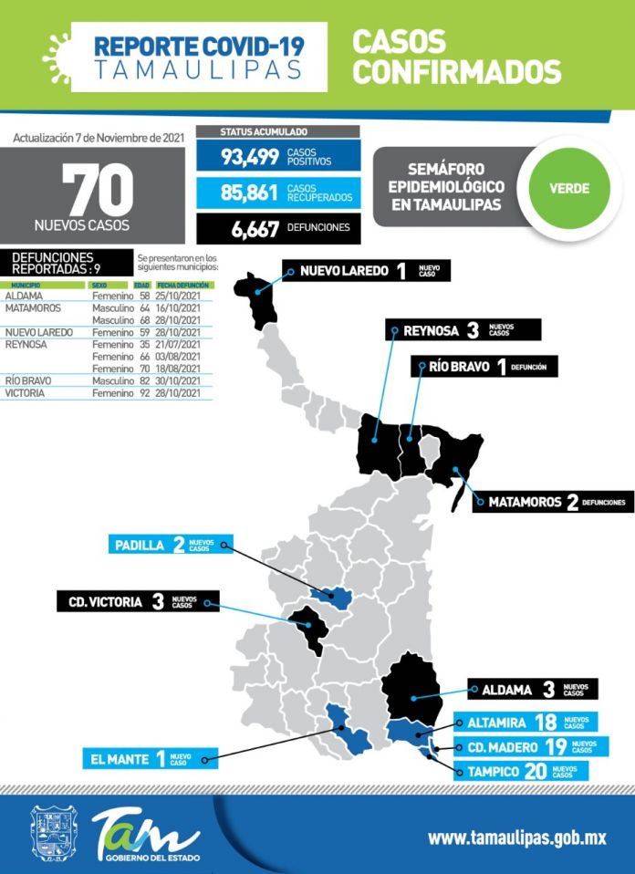 CIUDAD VICTORIA, Tamaulipas. – Al presentar el balance oficial de la pandemia de COVID-19, la secretaria de Salud de Tamaulipas, Gloria Molina Gamboa confirmó 70 nuevos casos y 9 fallecimientos, por lo que insistió en seguir actuando con responsabilidad y poder continuar en semáforo epidemiológico color verde.