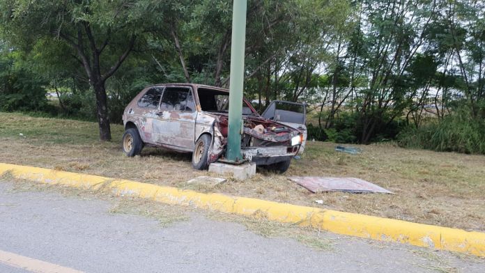El conductor de una Caribe término presuntamente en el hospital, luego de estrellarse de frente contra una luminaria, al interior del carro se encontraron latas de cerveza de la marca Tecate.