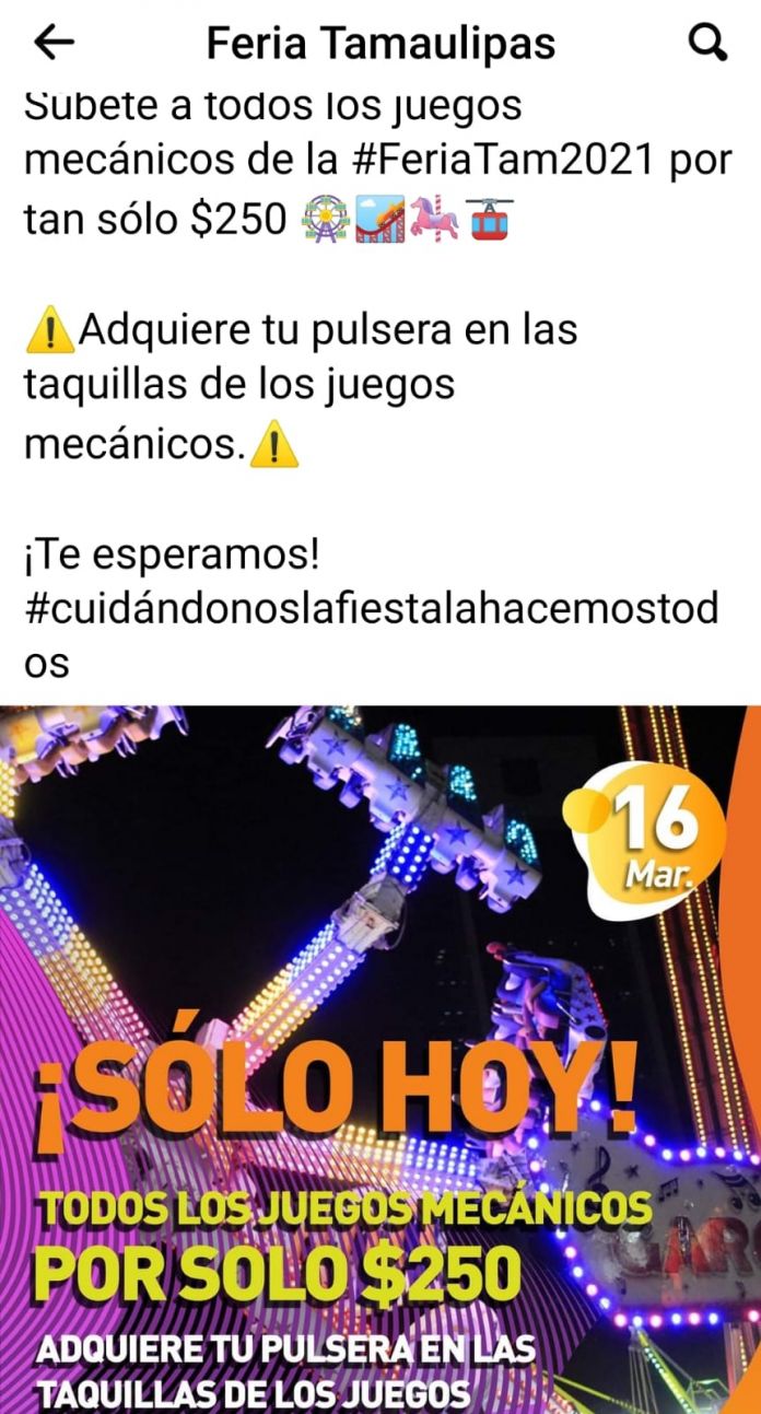 Para aprovechar la promoción, la Feria Tamaulipas, a través de su cuenta oficial de Facebook, llamó a la población a adquirir su pulsera en las taquillas de los juegos.