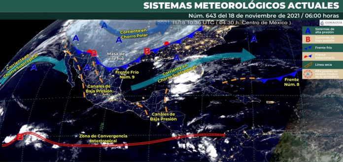 CIUDAD VICTORIA.- A partir de hoy jueves ingresa a Tamaulipas el frente frío número nueve de la temporada, el cual vendrá acompañado de lluvias de ligera a moderada puntual, así como viento moderado.